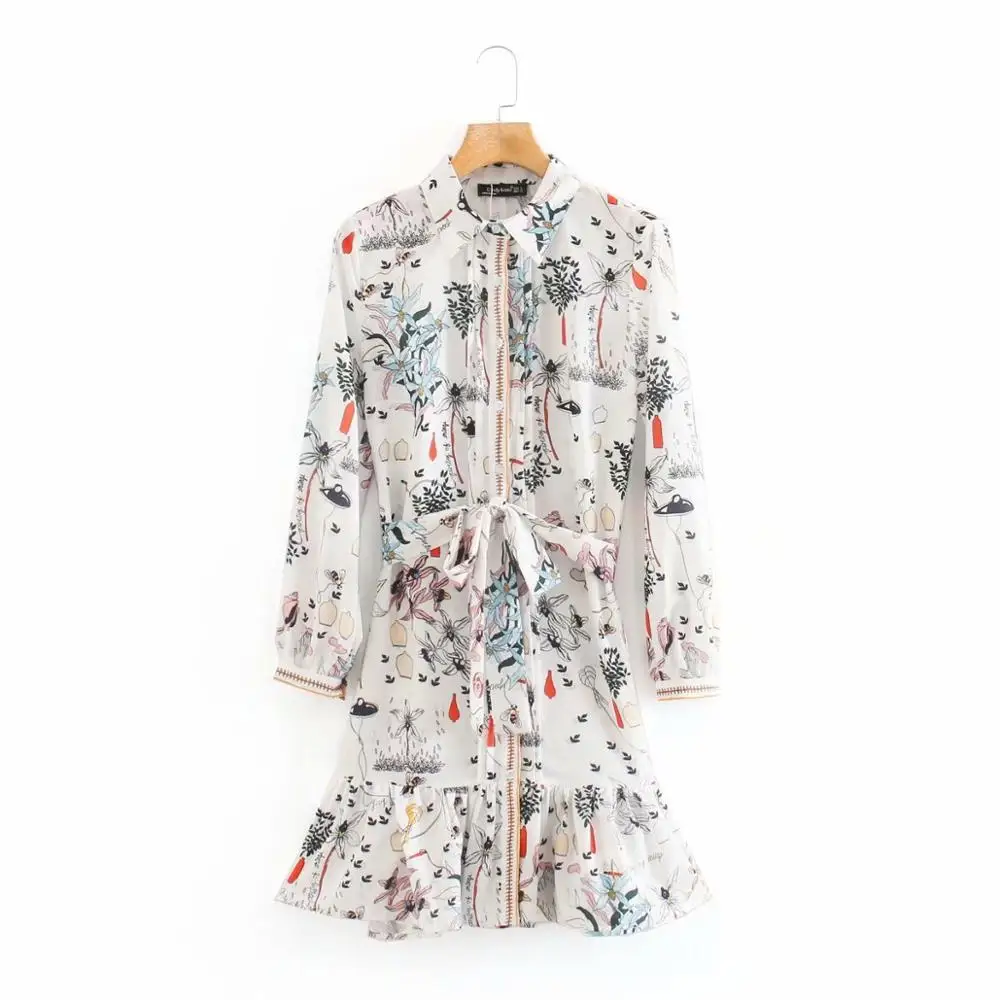 2020 женское модное платье-рубашка с цветочным принтом и поясом, шикарное женское платье с длинным рукавом и оборками, повседневные платья на пуговицах DS3823