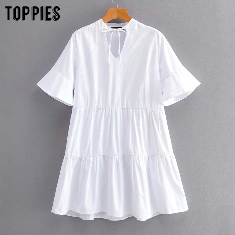 Белое платье-футболка с коротким рукавом, Летнее мини-платье с расклешенными рукавами и оборками, 2020