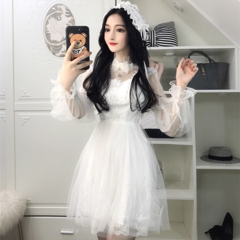Женское элегантное белое Черная кружевная сеточка вечерние платья милое бальное платье с пышными рукавами мини-платье водолазка милое ска...