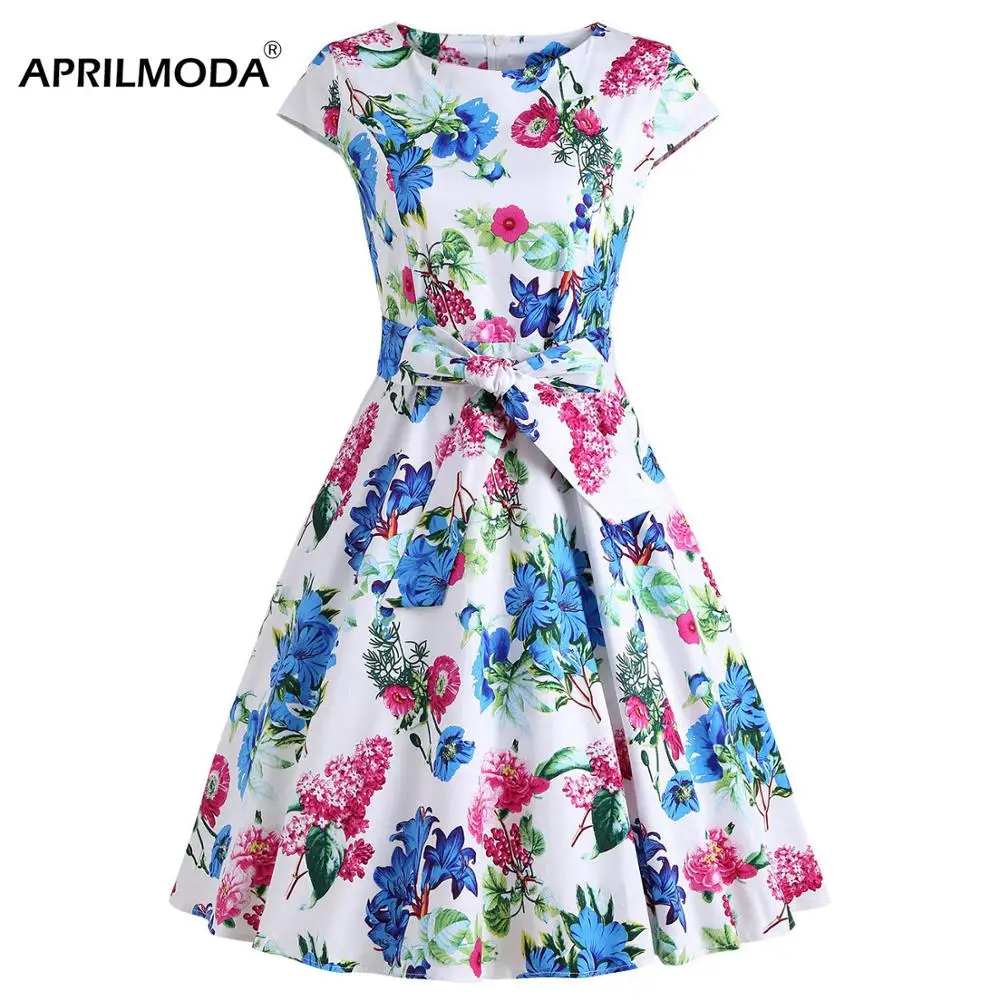 Ретро платья с коротким рукавом женские винтажные платья плюс размер Femme Vestidos цветочные 50s халат рокабилли женские вечерние платья из хлопк...