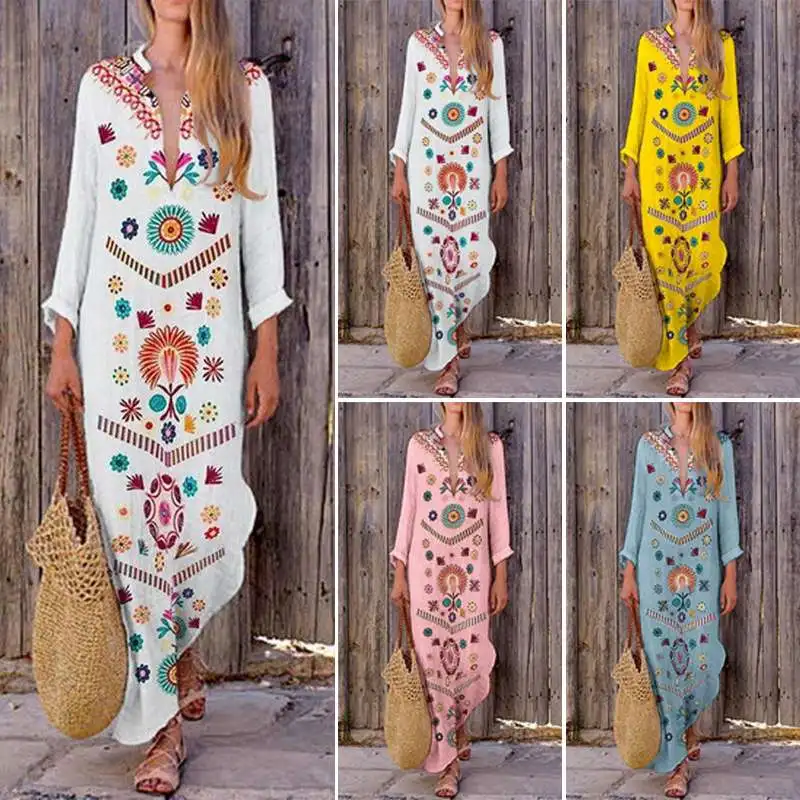 Богемное летнее макси платье женский сарафан с принтом 2019 ZANZEA с v-образным вырезом Сплит длинный Vestido женский винтажный Повседневный халат н...
