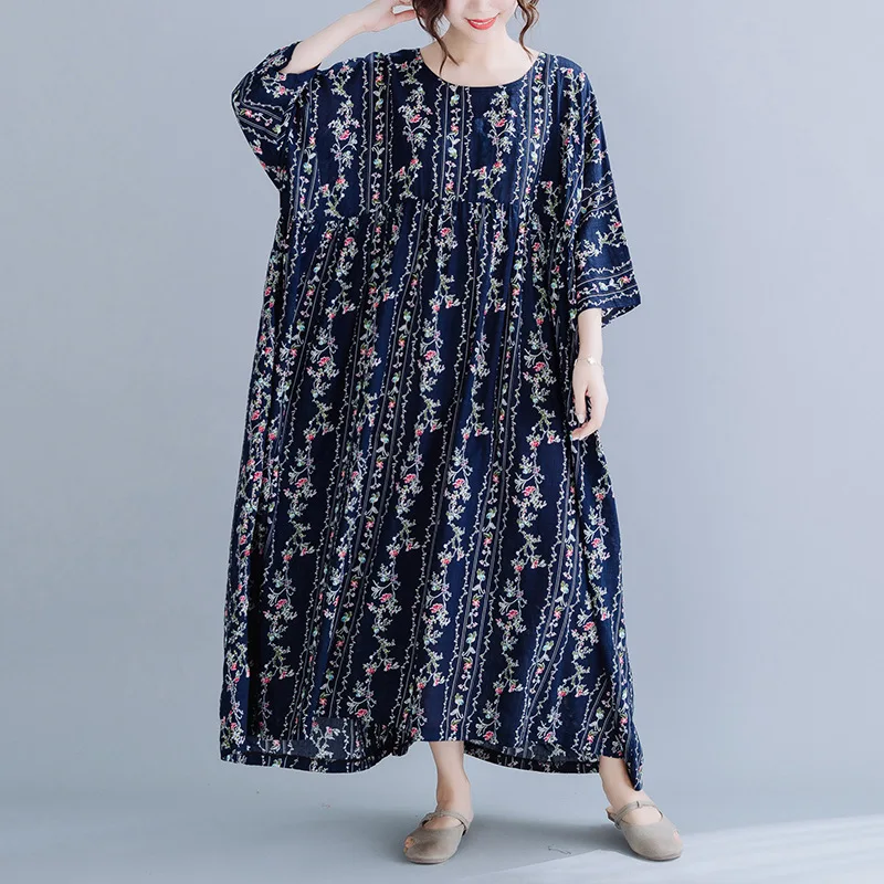 Новинка 2019, женская одежда размера плюс, летние женские длинные платья с круглым вырезом и рукавом три четверти, свободное Повседневное платье с принтом