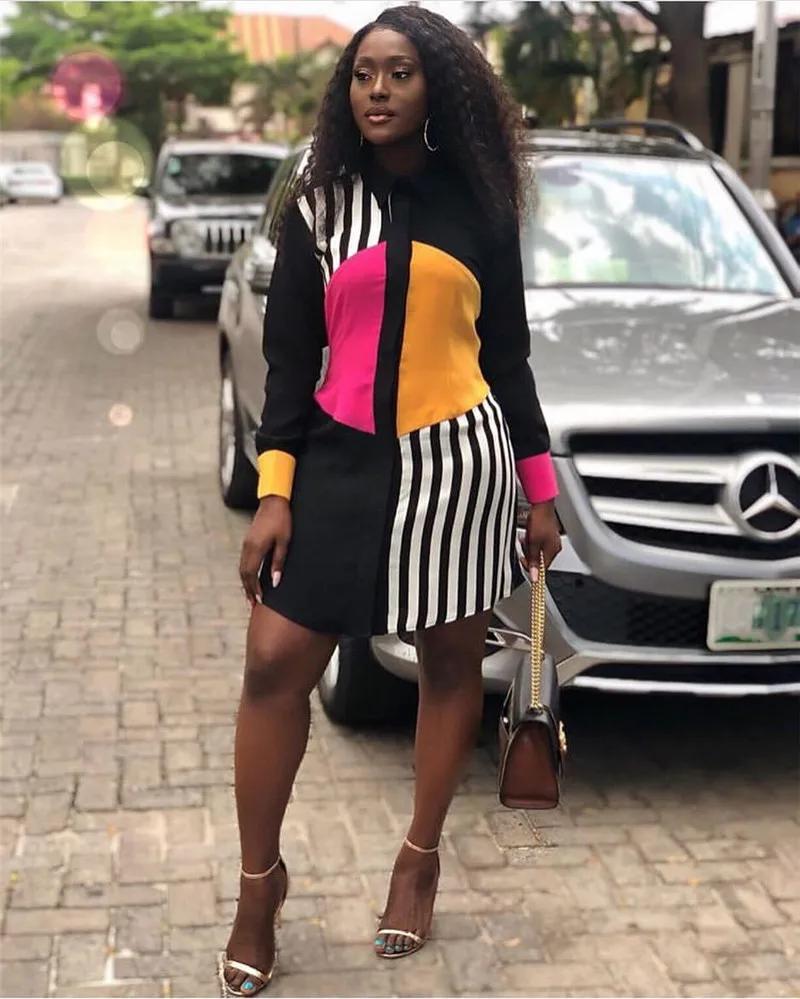 Женское летнее платье-рубашка с длинным рукавом, уличная одежда 2020, офисное Полосатое Повседневное платье длиной до колена, черные свободные вечерние платья миди на пуговицах