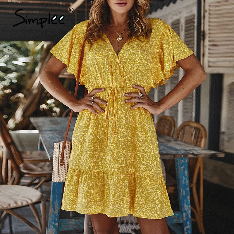 Simplee женское платье с цветочным принтом и v-образным вырезом, с оборками, с высокой талией, с поясом, свободное летнее платье, Повседневная Пр...
