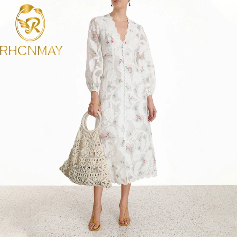 Новое Белое Элегантное однобортное женское платье с цветочной вышивкой и разрезом, лето 2020, v-образный вырез, длинный рукав, ТРАПЕЦИЕВИДНОЕ ПЛАТЬЕ МИДИ, Vestidos