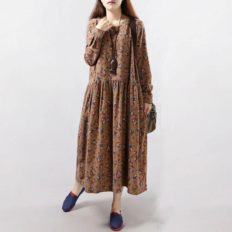 Демисезонный Длинные свободные Винтаж платье Для женщин с длинным рукавом Цветочный принт хлопок и лен платья Красный, Кофе, Темно-синие ха...