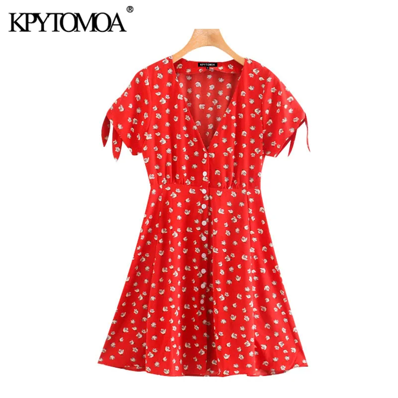 Женское плиссированное платье с цветочным принтом KPYTOMOA, винтажное мини-платье с v-образным вырезом и короткими рукавами, модель 2020