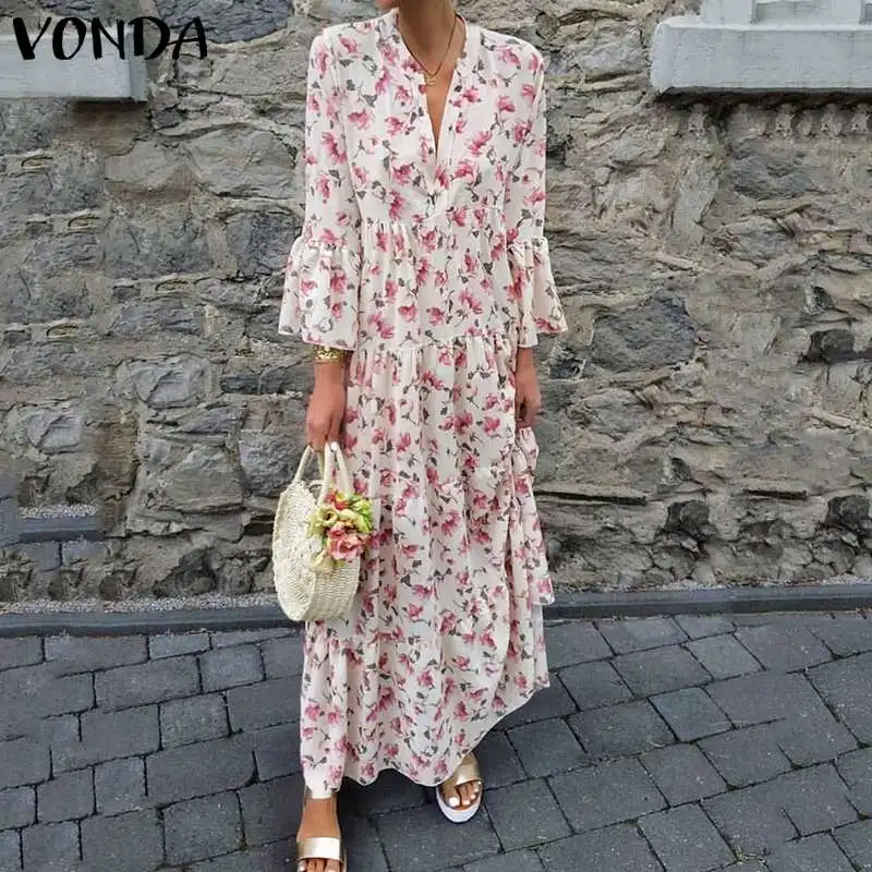 Женское винтажное платье макси с принтом 2019 VONDA осень 3/4 рукав v-образный вырез Длинные платья размера плюс богемное женское платье S-5XL