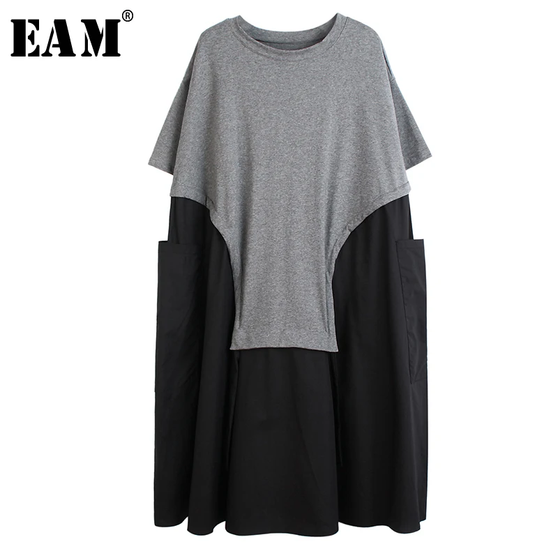 [EAM] женское серое платье с большим карманом и разрезом большого размера, новинка, круглый вырез, короткий рукав, свободный крой, мода, весна-лето 2020, 1S592