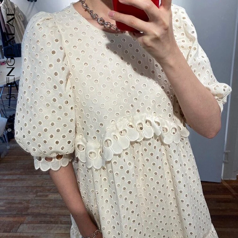 SHENGPALAE, комбинированное женское платье, круглый вырез, пышное, короткий рукав, выдалбливают, большие размеры, свободные, миди платья, женская одежда, новинка 2020, ZA3842