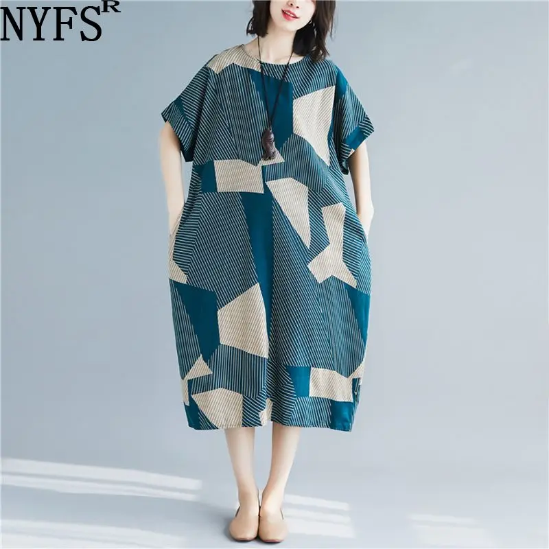 Платья женские 2019 лето осень хлопок льняное с короткими рукавами платье свободное с v-образным вырезом миди платье плюс размер 5xl винтажная ...