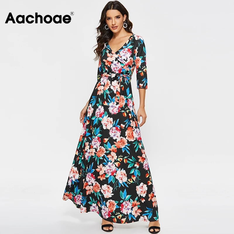 Длинное Макси-платье для женщин, осень 2020, винтажное платье с цветочным принтом, Повседневное платье с поясом, с рукавом до локтя, v-образный вырез, платья в стиле бохо, Vestidos Largos