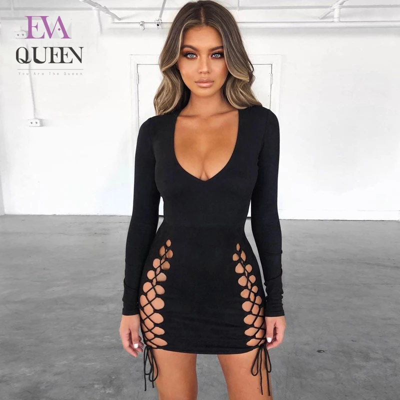 Slaygirl/черные вечерние сексуальные платья, женское мини платье с длинным рукавом, облегающее платье, открытое осеннее платье с глубоким v-обра...