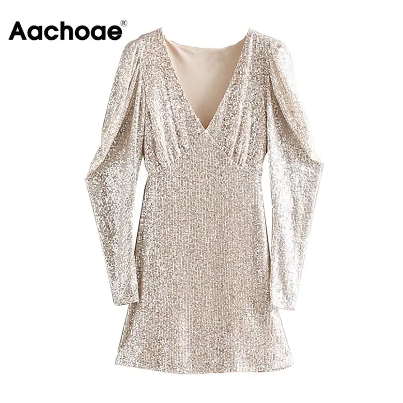 Сексуальное блестящее мини-платье с блестками, женские модные вечерние платья с длинными рукавами-фонариками и v-образным вырезом, Элегантн...