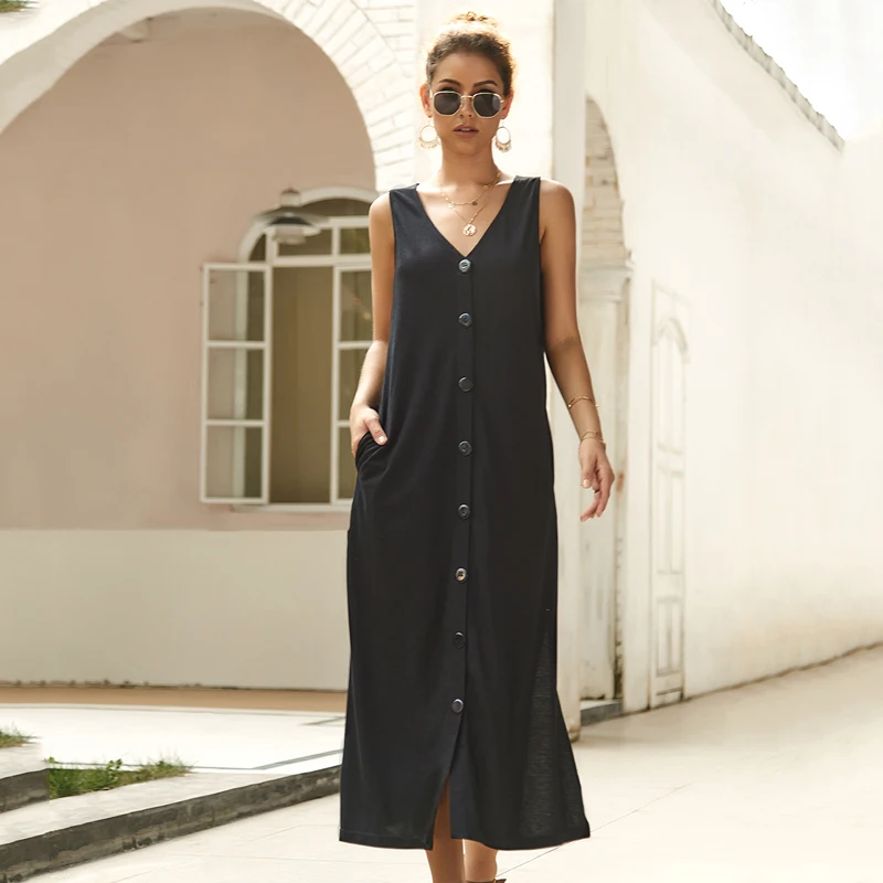 2020 летнее однотонное платье макси для женщин, повседневное черное однобортное платье без рукавов с v-образным вырезом и высокой талией с пуговицами, свободные длинные платья