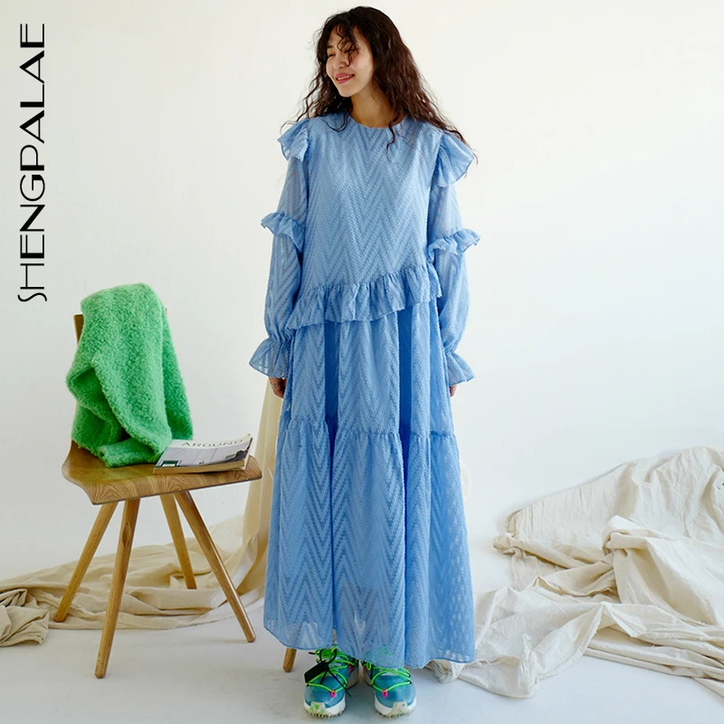 SHENGPALAE, весна 2020, Новое поступление, платья с круглым вырезом, свободные, с разрезом по краям, с роговыми рукавами, синее платье с длинными рук...