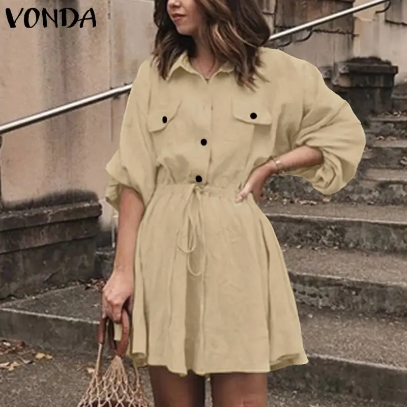 VONDA, женское осеннее платье, повседневное, свободное, длинный рукав, отложной воротник, мини платье, 2020, длинный рукав, рубашки, офисный сараф...