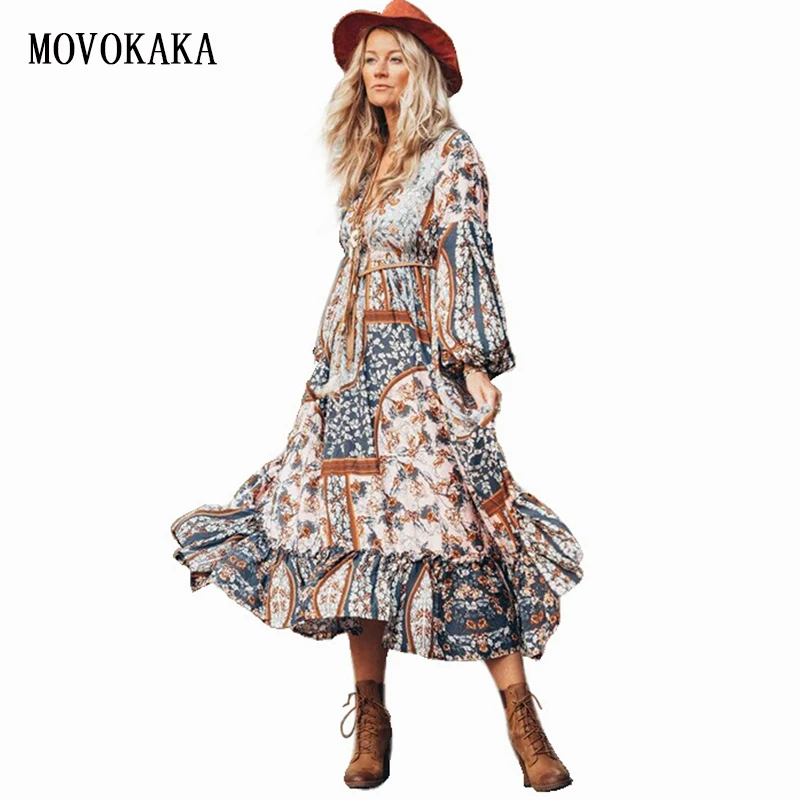 Женское длинное винтажное платье Boho, шифоновое платье большого размера с длинным рукавом, весна-лето 2020