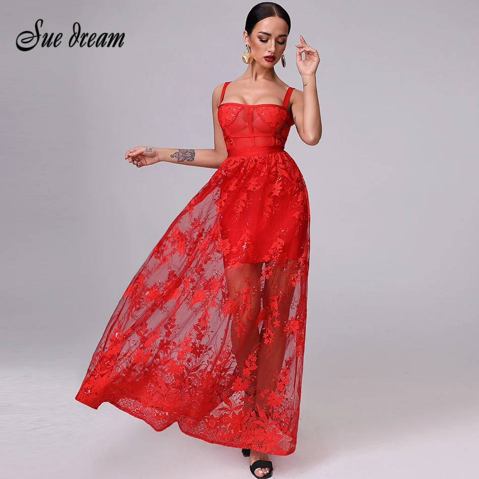 Пикантные Красные кружевные Для женщин Бандажное платье Летнее 2019 Спагетти ремень облегающее Клубное длинное перспектива модная обувь; вы...