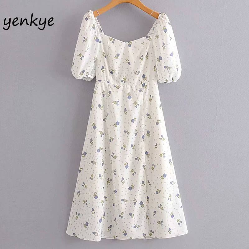 Милое женское платье с цветочным принтом, короткий рукав, квадратный вырез, сексуальные разрезы, а-силуэт, платье миди, летнее, vestidos DJF9019