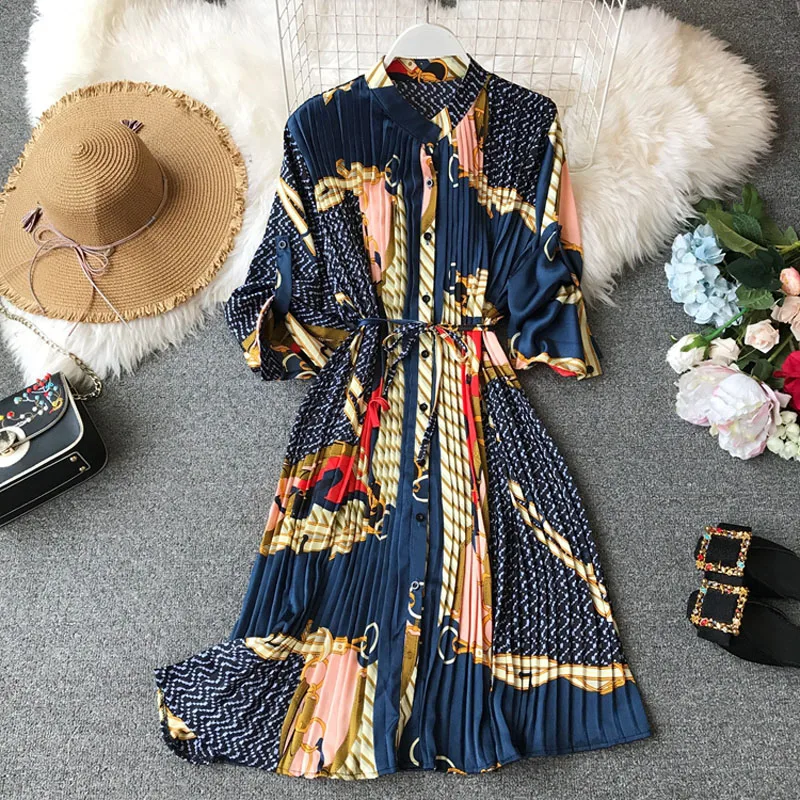 Летняя футболка с рисунком платье Длинные рукава стенд воротник талии галстук платье с принтом для девочек свободные хлопковые шифоновое п...
