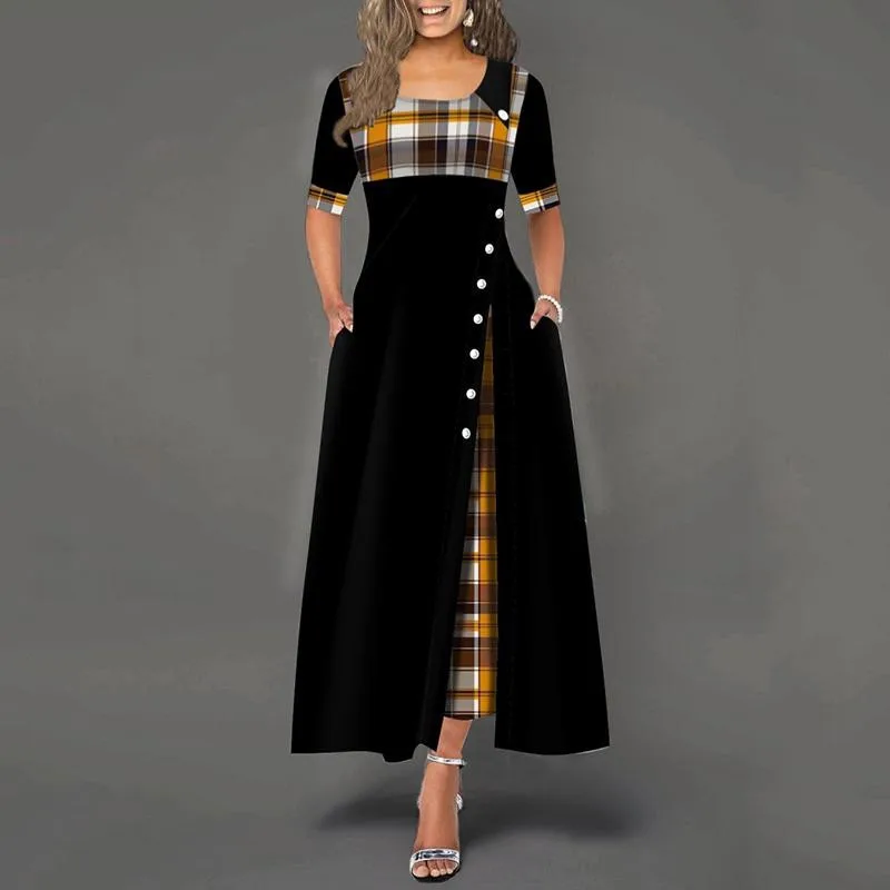 Элегантное длинное женское модное платье с рукавом средней длины, асимметричное платье в клетку с пуговицами, платье макси на весну и лето, Платья для вечеринок с круглым вырезом