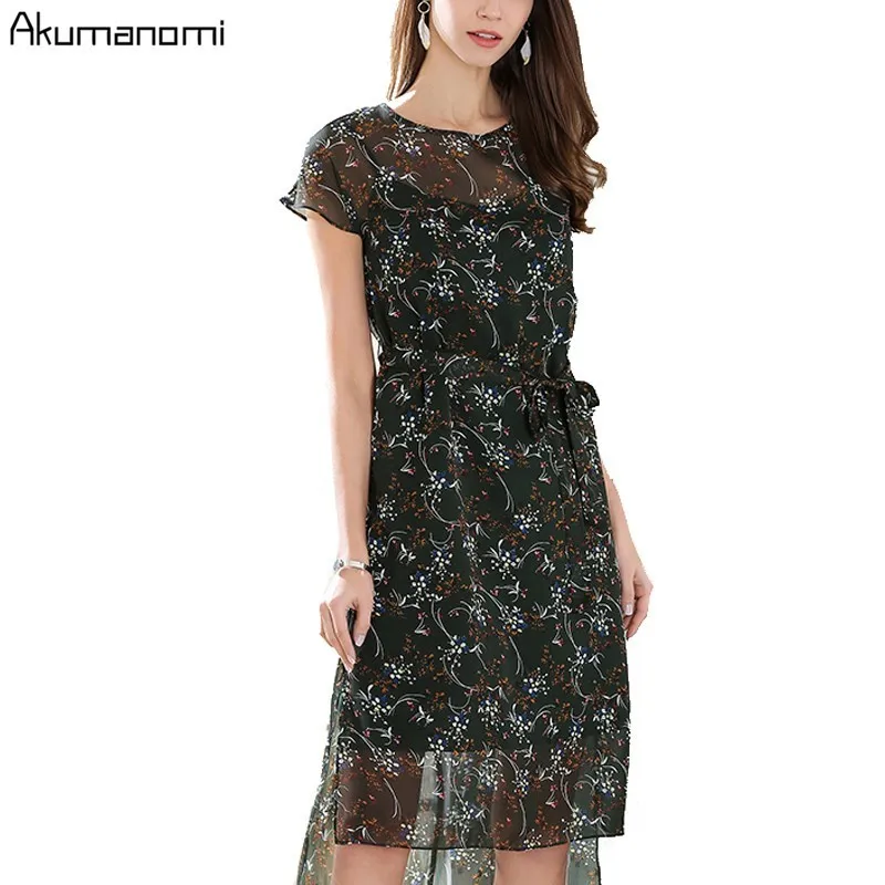 Летнее шифоновое платье женская одежда на шнуровке с круглым вырезом с коротким рукавом с поясом с асимметричным подолом платье плюс разме...