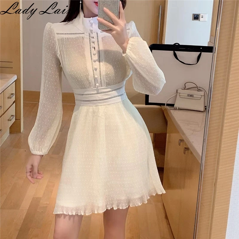 Весна 2020, подиумная Женская одежда, плиссированное платье со стоячим воротником и длинным рукавом, однобортное кружевное платье в горошек