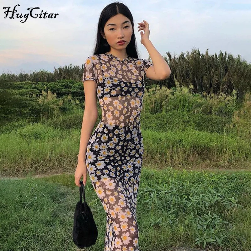 Hugcitar 2020 короткое рукавами ромашки принтом принт сетка сеткой Прозрачное нижнее белье сексуальные длинное платье Летнее летний лето Женская мода уличная одежда наряды сарафан Сарафаны