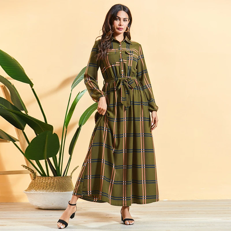 Женское платье-рубашка Siskakia, армейское зеленое клетчатое платье макси, однобортное платье с длинными рукавами и карманами
