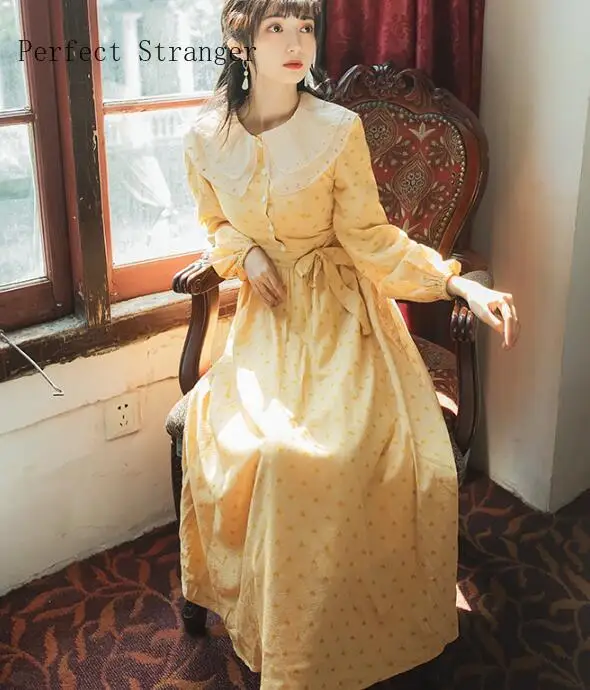 Высокое качество, осень 2019, Новое поступление, во французском стиле, воротник Питер Пэн, узор в горошек, женское хлопковое длинное платье желтого цвета