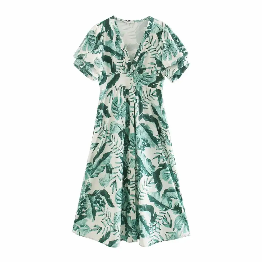 Женское платье-рубашка с принтом Тропических Зеленых Листьев, повседневное приталенное платье средней длины с рукавами-фонариками, DS3831, новинка 2020