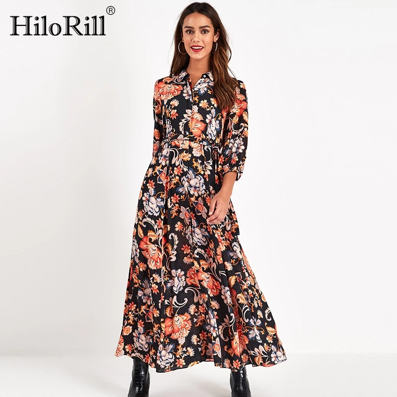 Длинное женское Платье макси с цветочным принтом, Элегантное повседневное платье-рубашка с отложным воротником, рукав три четверти, богемные платья с поясом