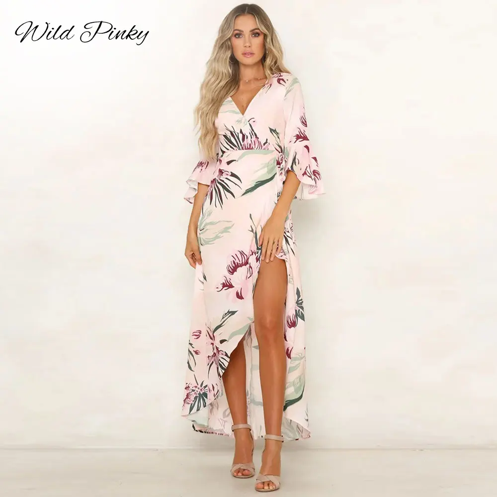 Женское длинное платье с цветочным принтом WildPinky, Пляжное Платье макси с v-образным вырезом, вечернее детское летнее платье, 2020