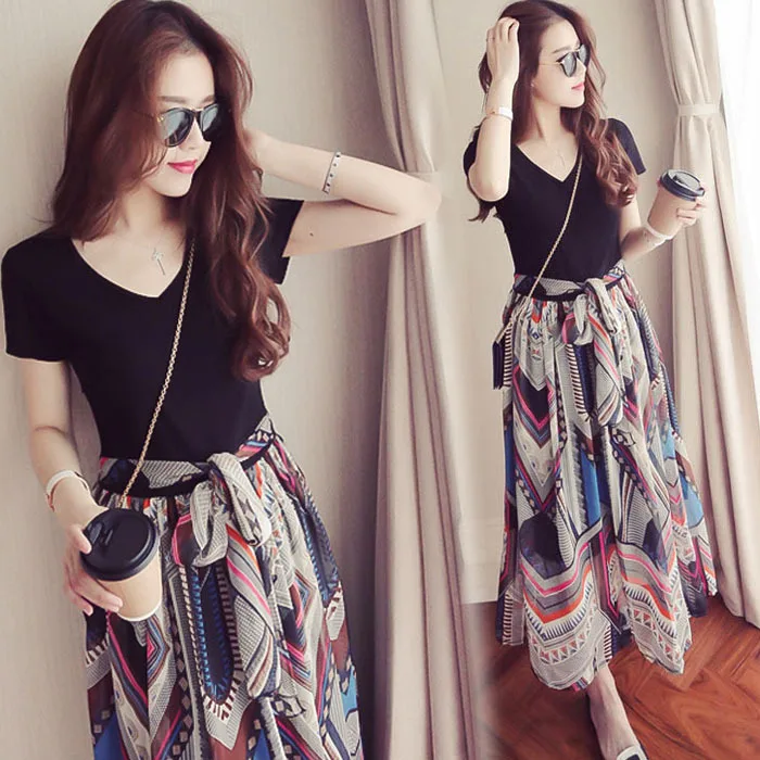 Boho сшитое женское платье 2019 летние цветочные шифоновые с v-образным вырезом с высокой талией длинные платья с коротким рукавом тонкие пляжн...