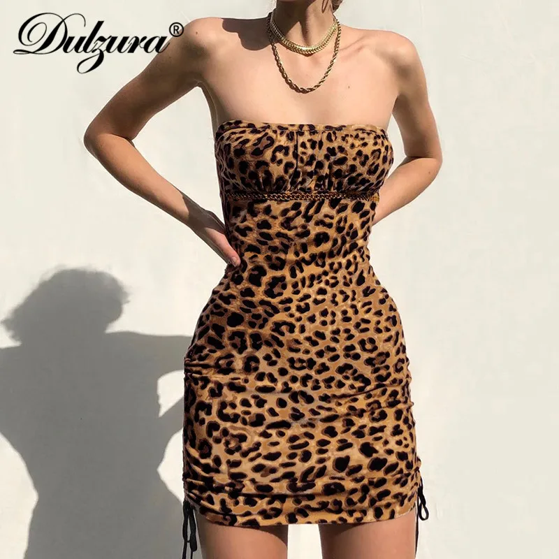 Dulzura с цепью со складками леопардовое Леопард мини-платье Бандажное Без Рукавов облегающее обтяжку шнурок уличная одежда 2019 на осень-зиму в...