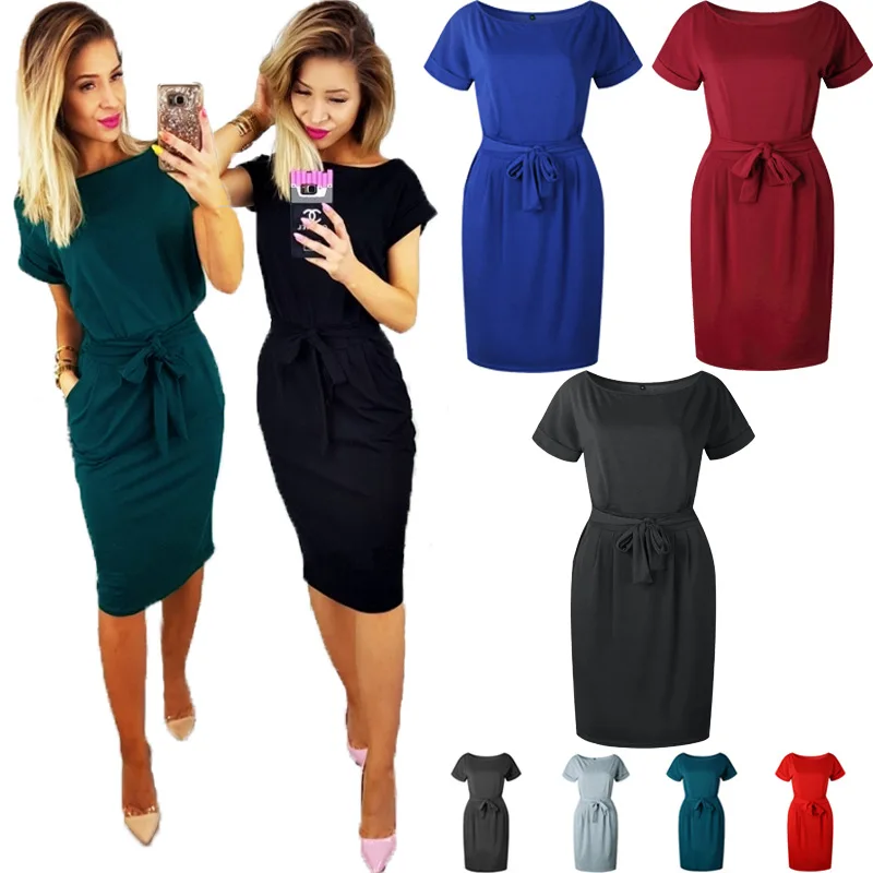 Oufisun 2019 модное однотонное Повседневное платье с О-образным вырезом и карманами, простое летнее дамское дышащее платье Vestidos нового размера п...