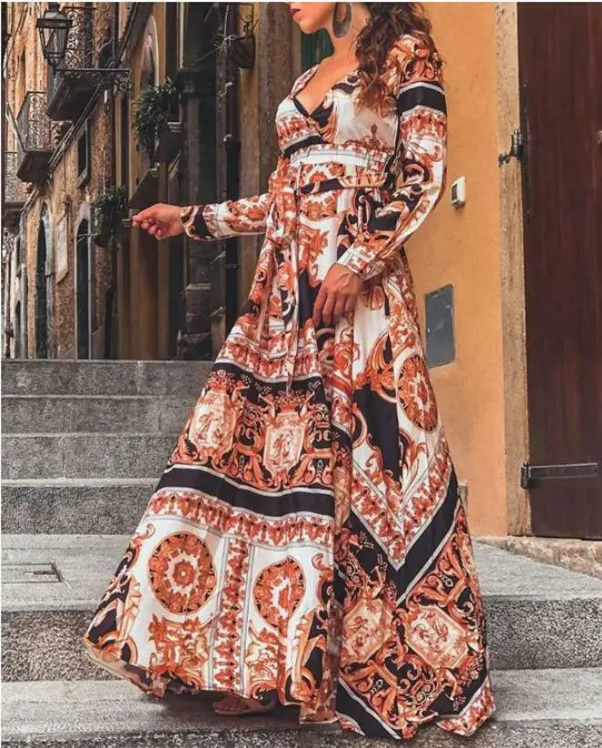 Женская одежда 2020, макси платья для женщин, v-образный вырез, длинный рукав, бохо принт, оранжевое этническое осеннее винтажное длинное платье