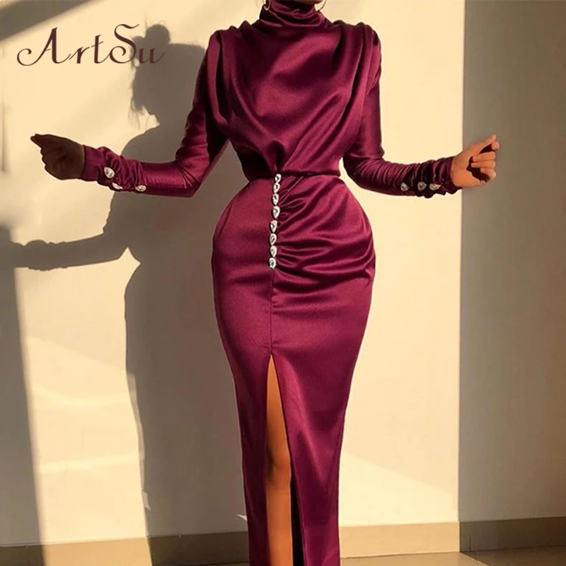 Artsu Сатиновые платья макси для вечеринок, сексуальные женские платья Elegnt с длинным рукавом, облегающие платья с воротником-хомутом, новинка 2020, Клубная одежда ASDR60697