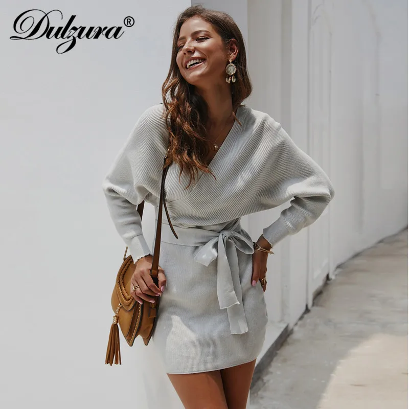Dulzura/2019 осенне-зимний женский свитер с запахом, трикотажное сексуальное леопардовое платье с открытой спиной, элегантные вечерние Фестивал...