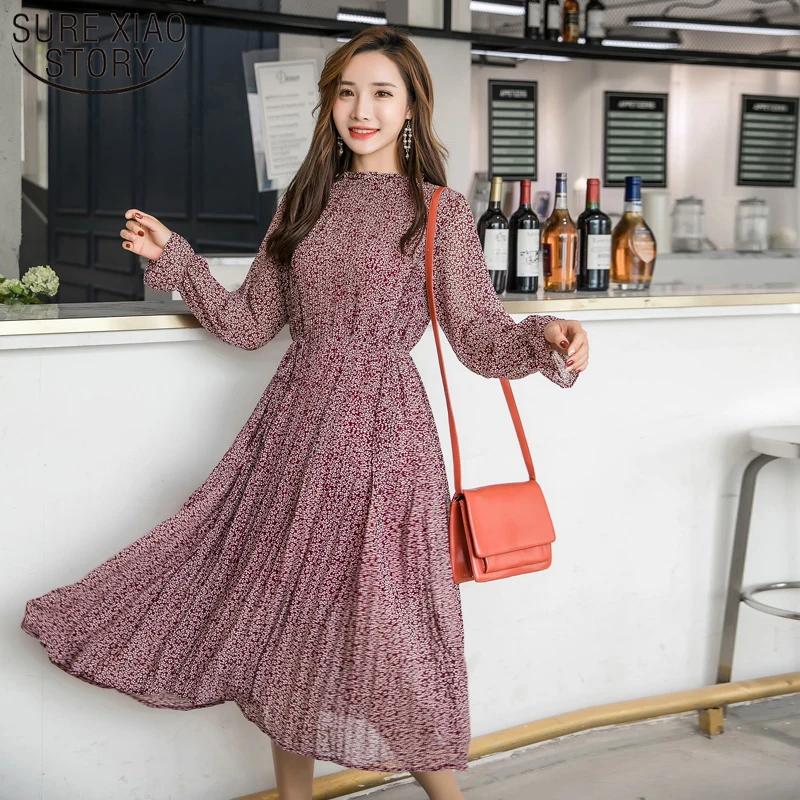 2019 Элегантный квадратный вырез цветочный принт женское платье длинный рукав эластичная тонкая талия шифоновое весеннее ТРАПЕЦИЕВИДНОЕ дл...