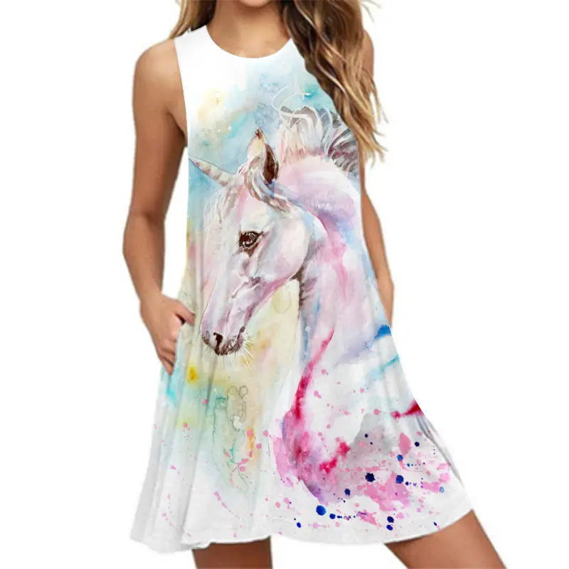 Летнее женское новое платье без рукавов 3D цифровой единорог Печать o-образным вырезом с пакетом дамы 2019 Мода Цельный купальник