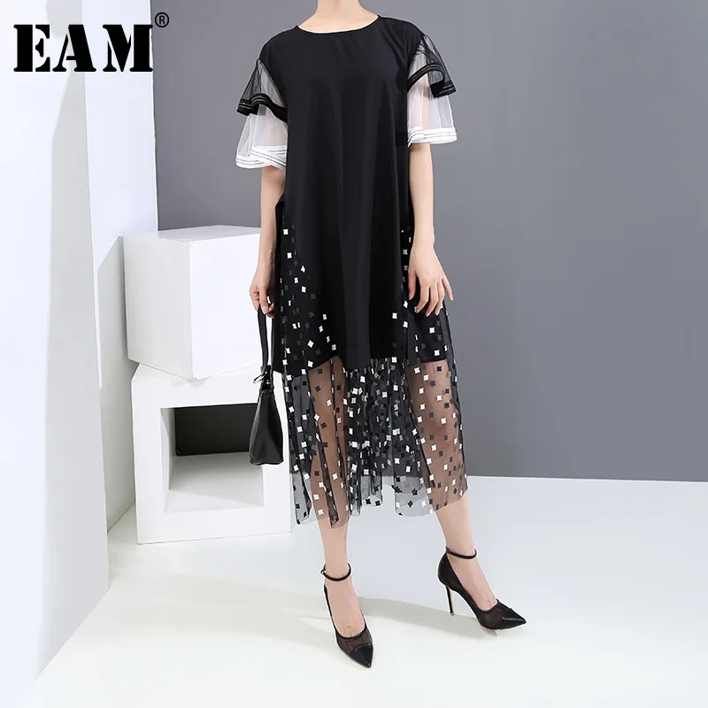 Женское платье с принтом EAM, черное платье большого размера с коротким рукавом и круглым вырезом, весенне-летняя мода 2020 1U120