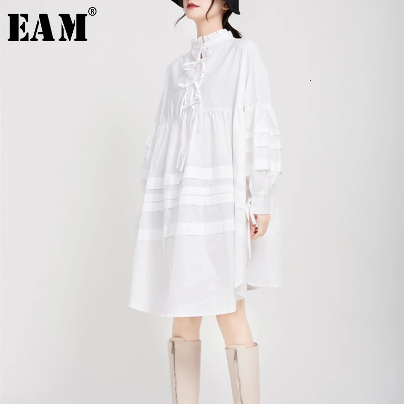 [EAM] женское белое платье с оборками, с разрезом, большие размеры, новое платье с воротником-стойкой, длинный рукав, свободный крой, мода весна...