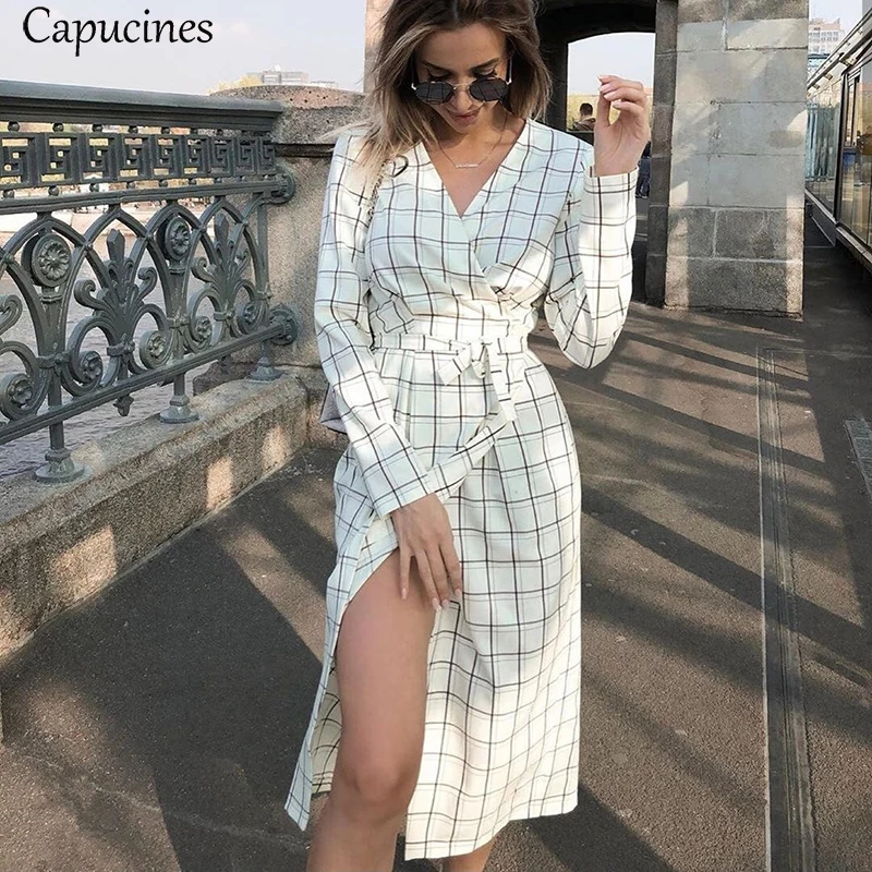 Женское платье в клетку Capucines, летнее платье миди с длинным рукавом и поясом, элегантное офисное платье для вечеринок