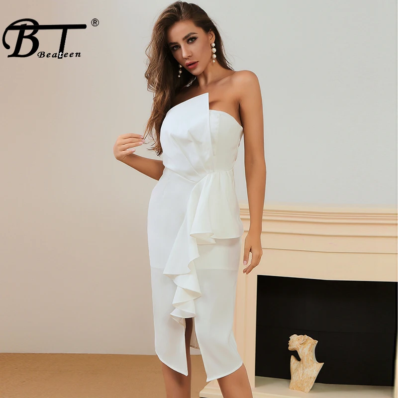 Beateen Элегантный насыщенный Белый Русалка Весна Женское вечернее платье пикантные Slash шеи спинки без бретелек миди Для женщин Бандажное плат...