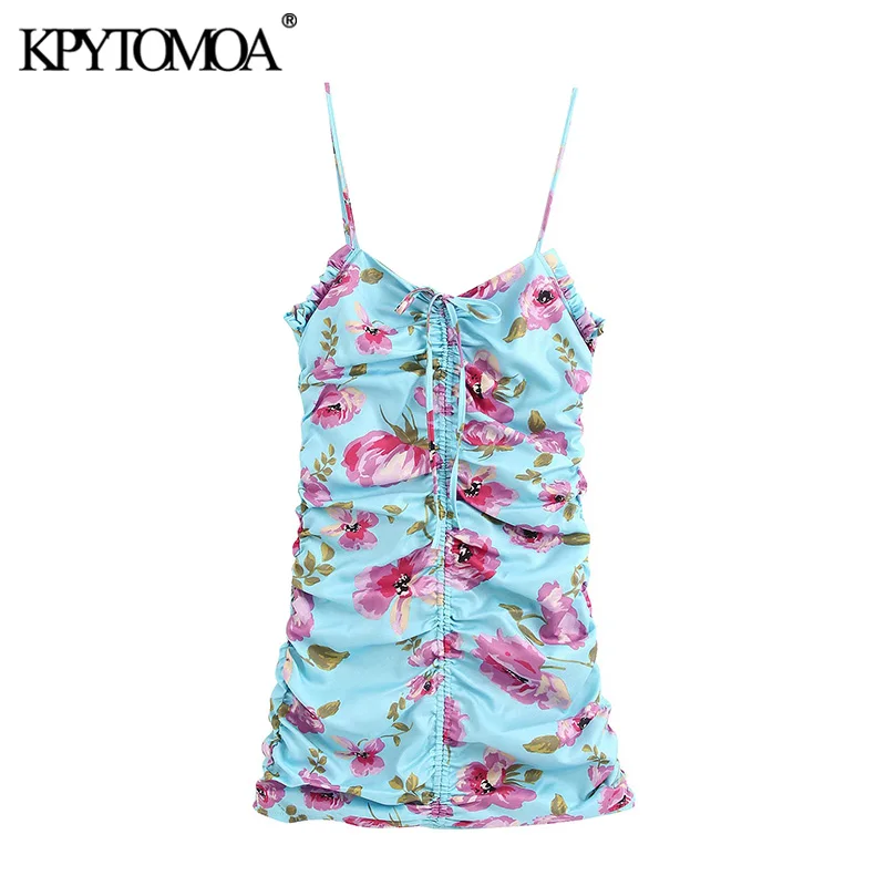 Женское драпированное платье с цветочным принтом KPYTOMOA, винтажное мини-платье с v-образным вырезом и застежкой-молнией сзади, регулируемые бретельки, 2020