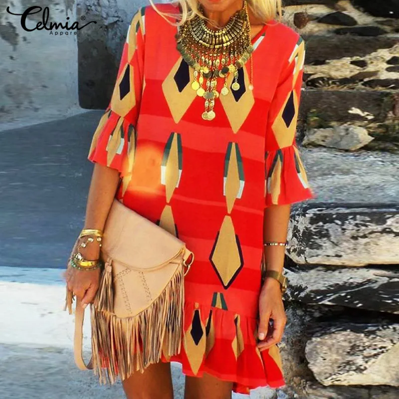 Винтаж печатных женское платье Celmia 2019 Лето Женское с короткими рукавами Повседневное Свободные мини платье с оборками платье в богемном ст...