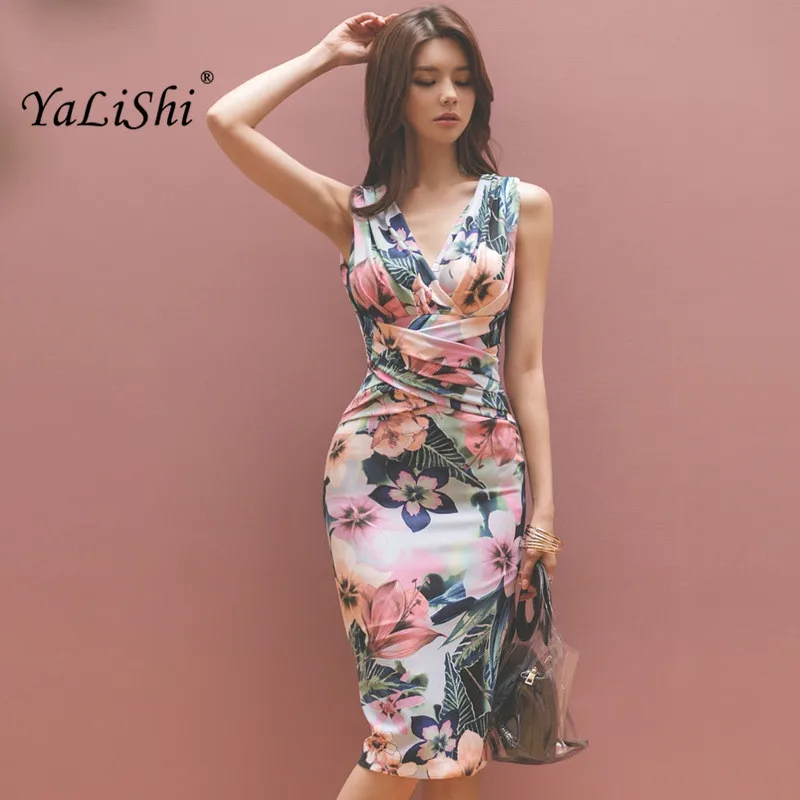 Плюс Размеры цветочные Карандаш платье Для женщин без рукавов с v-образным вырезом Танк платье миди элегантные офисные Винтаж вечерние Клуб...