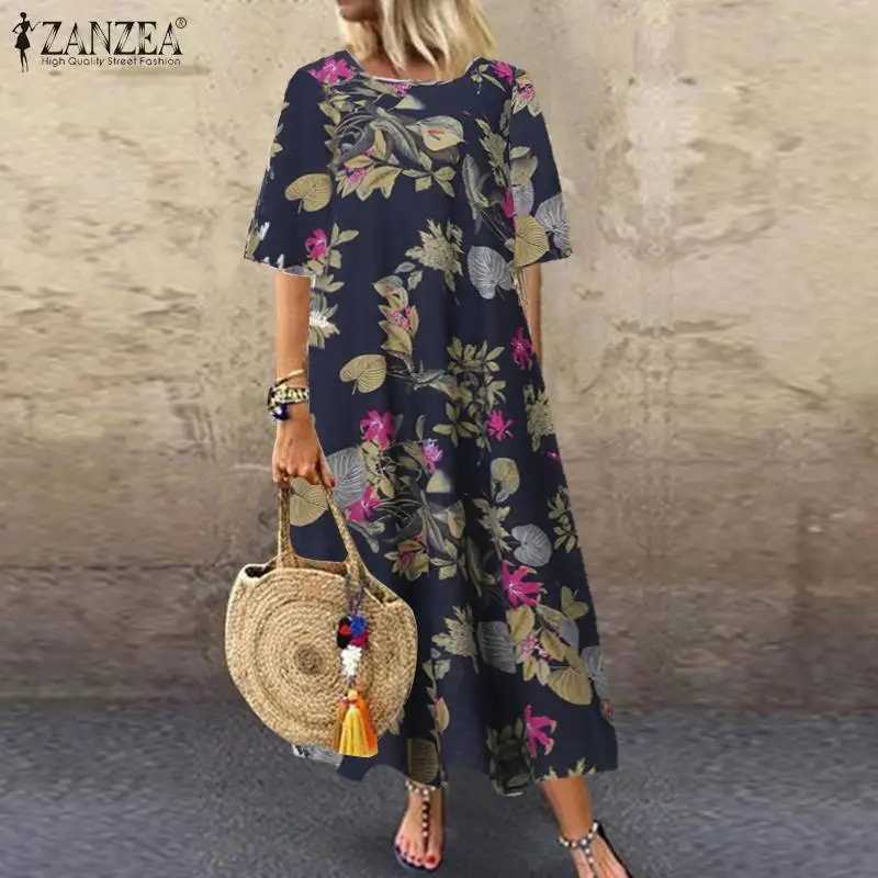 Летнее винтажное хлопковое льняное платье с принтом ZANZEA, женский свободный длинный сарафан с коротким рукавом, повседневное богемное платье-кафтан, мешковатые